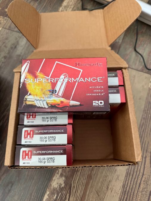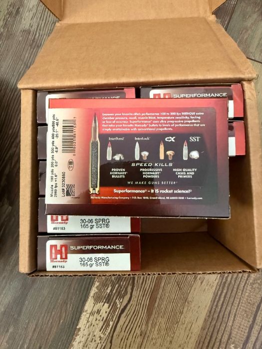 I have 8 boxes of Hornady Superformance 30-06 165gr SST. 20 rounds per box. These sell for $47 per box at Cabela’s. Selling the 8 boxes for $320 ($40/box).
