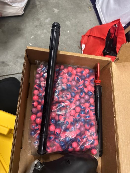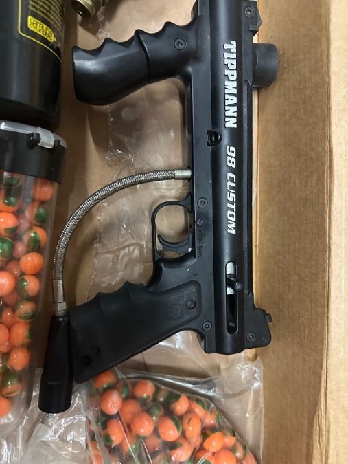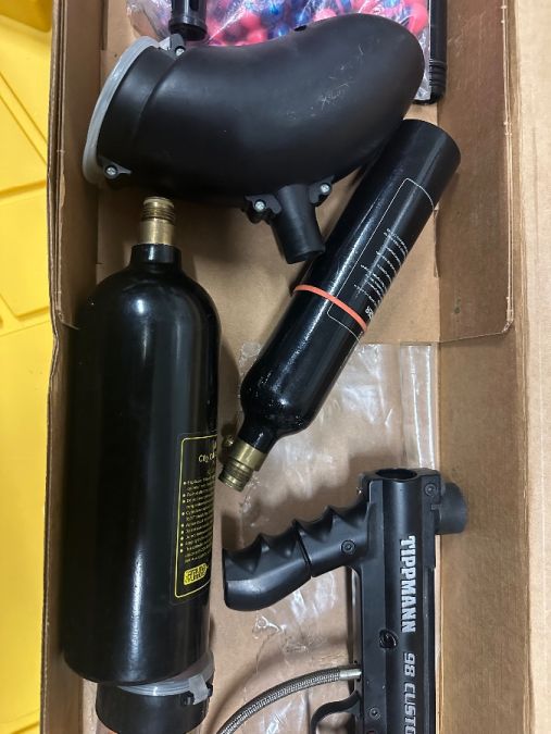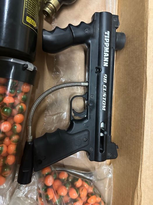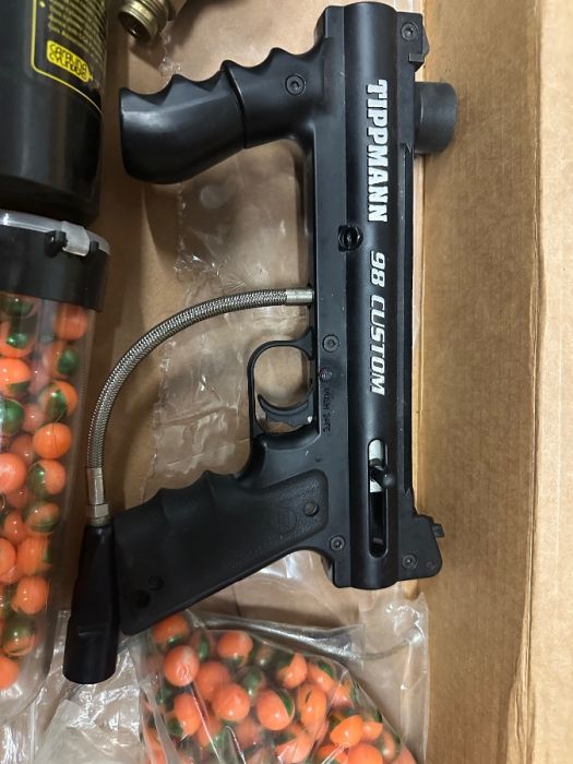 This is a Tipman 98 Custom paintball Gun. Comes with a standard and sniper barrel. Plus 2 CO2 tanks and paintballs. Please let me know if you have any questions. Paintball, Paintball Gun, Tipman, 98 Custom