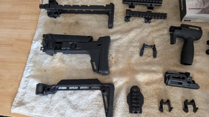 I have a bin full of parts for your favorite 80's sub gun, lots of parts for the short or Kurz (K) model. I have a full size, and was planning to do another build as a K, but I am good with just my full size and the other PCCs I own. So, the parts I have collected can go. As seen in the pictures, I have the following, all either brand new or very lightly used:
