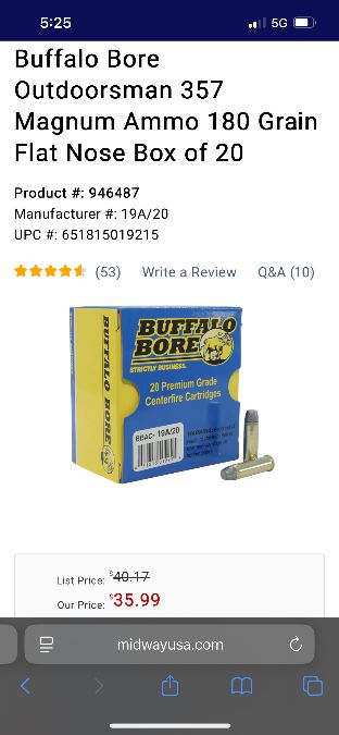 I have 5 boxes of the BUFFALO BORE 357 MAGNUM OUTDOORSMAN 180 hard cast lead flat nose 100 rounds total! 20 rounds per box there are 5 boxes. Sold as one lot. First 150.00 gets them all. Open to trades what do you have? Shoot me a text or call 208-841-3745. Thanks for looking.