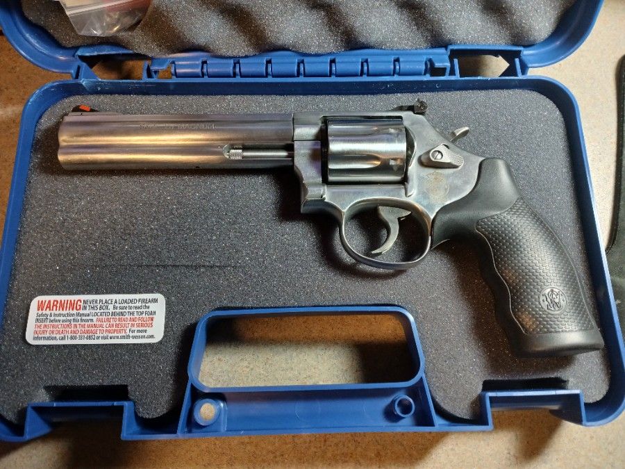 Bought on a whim. Never fired. New in the box, kept in the safe. Smith Wesson Model 686-6 Stainless. 6" barrel. Includes 2 boxes Remington HTP ammo.