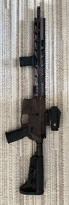 Complete and ready for the range. Super flat shooter. Rattle canned brown with black furniture Lower Built aero precision m4 lower, bcm pnt trigger, Odin werks extended mag release. Magpul sl-k Upper Aero precision stripped upper. 14.5 5.56 faxon pencil barrel with mid gas system, aero adjustable gas block, pinned and welded brake to 16” barrel. Swampfox blade 1x prism red dot amber color. $800
