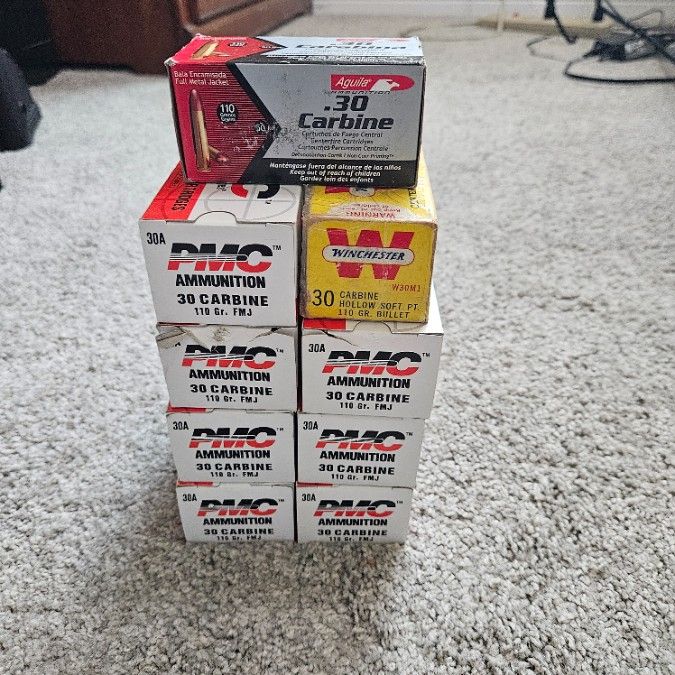450 rounds of Brass 30 Carbine Ammo and Case It's a good time to stock up! All brass 30 Carbine ammo, with one box of 50 Winchester hollow points. Bonus! Ammo case for your convenience. $315 Cash May be open to trades, prefer cash