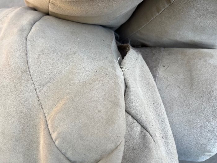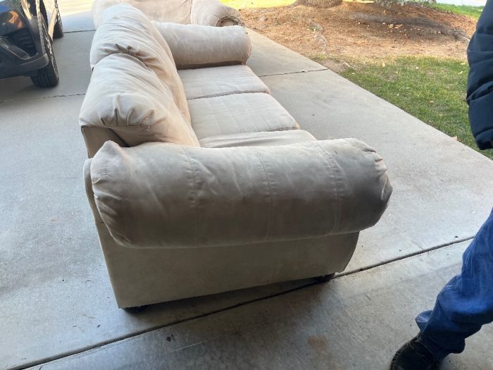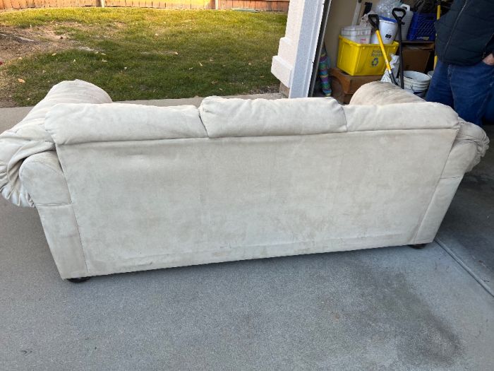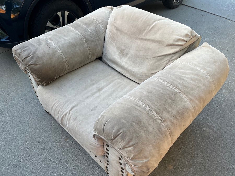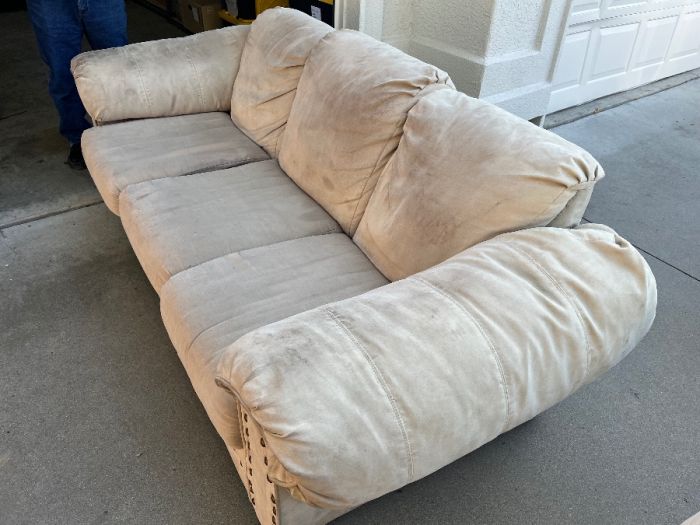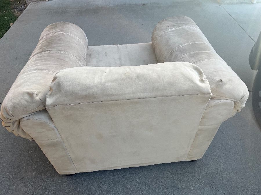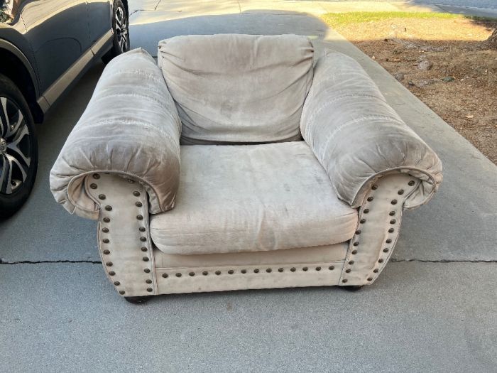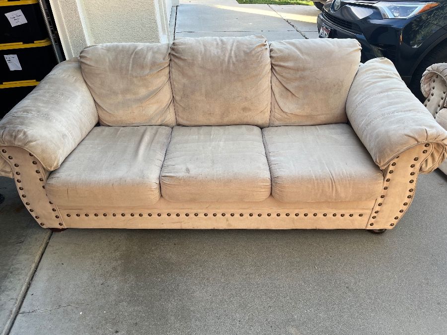 Nice beige set, a long couch and a very comfortable chair that basically surrounds you. Soft cushions and backing. Firm arms. Nice styling with studs down the arms and wooden feet. I’m not sure of the material, but it is soft and light. Blue elastic covers come with both pieces if you pay full price. They cover the whole front of couch and chair individually. One tear on the arm of the couch and some contact stains from long use.
