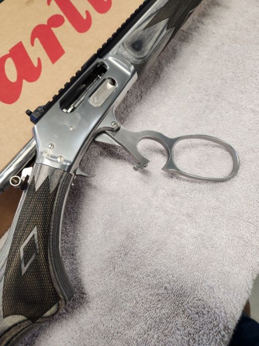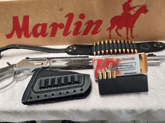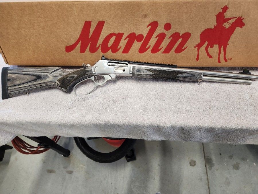 Marlin model 1895 45-70 Government in like new condition. This is the 19.1 inch threaded barrel, not the scout version, big loop lever action. I've had this rifle for about 2 years, only out of the safe one time to try it out. Maybe 10 rounds through the barrel, very accurate and powerful. I really love this rifle but I just look at it when I open my safe, don't use it. I'll add some discerptions from the Marlin web site. Included in this sale (pictured) is a sling, 18 rounds of ammo, but stock cover with ammo keeper, users manual, and original box. Just FYI, I paid over $1600 including tax. Price is or "make reasonable reasonable offer" Manufactures description: Time-honored styling including a polished stainless finish, gray laminate stock, polished bolt and threaded barrel contribute to this high-quality lever-action rifle. Fiber optic front sight with a tritium ring for improved visibility in low light conditions. Picatinny rail provides a stable mounting surface for scope rings and a variety of modern optics. Improved finish on the stock and forend and checkered grip panels provide superior grip in all conditions. Threaded barrel, with factory-installed thread protector, allows for installation of a muzzle brake or other barrel accessories.