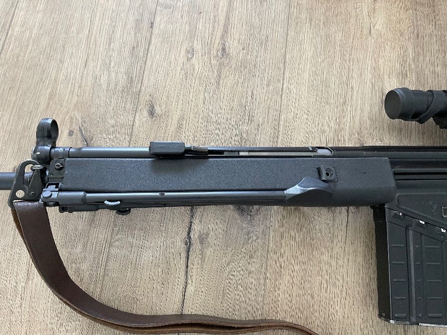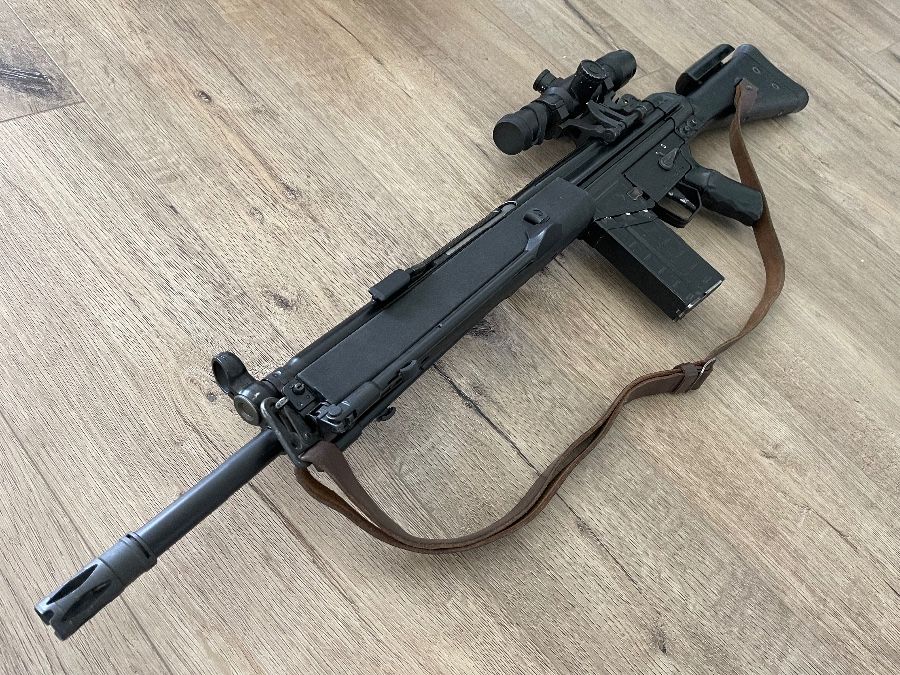 This is an EARLY JLD enterprises HK91 clone built with 90 percent HK parts and tooling. Has a bill Springfield trigger job. HK SG1 stock, HK wide forend with bipod. HK claw mount. IOR Valdada .308 4x Scope. Comes with 5 mags, HK brown leather sling and an original cleaning kit.