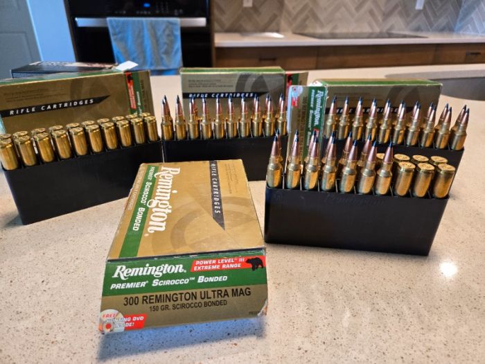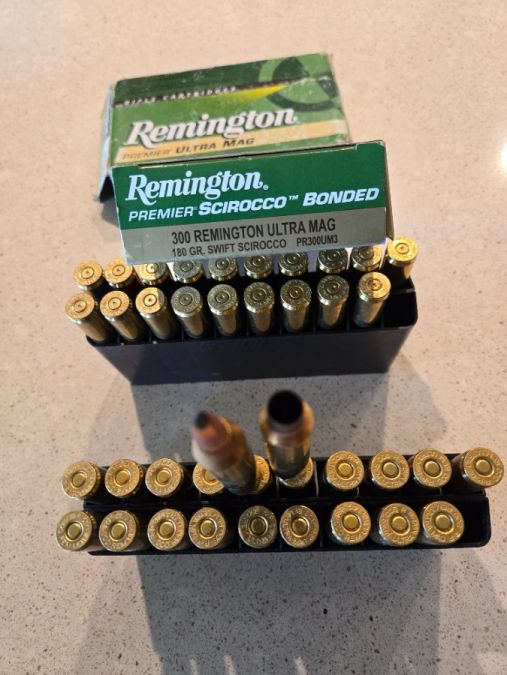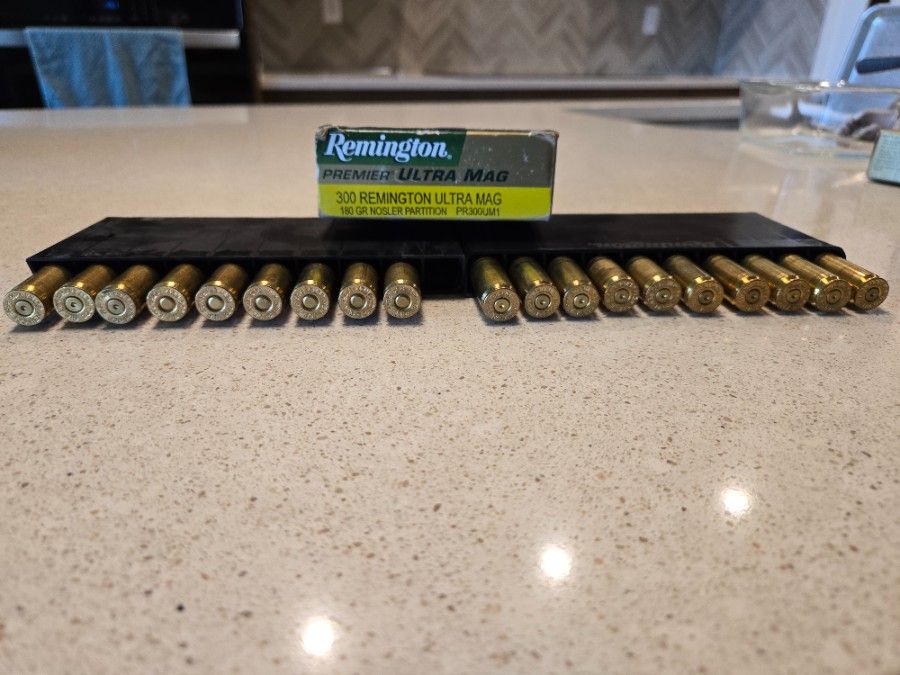 Description: Eight boxes of 300 RUM new bullets and brass. Mixture of 150 and 180 grain. 180 gr Scirocco - 20 new, 20 brass; 180 gr Core Lokt Ultra Bonded PSP - 16 new bullets, 4 brass; 180 gr Nosler Partition - 16 new bullets, 13 brass; 150 gr Scirocco Bonded - 53 new bullets, 27 brass. Total of 105 new bullets and 64 brass. $325 for the entire bunch (based on $3.25 each new bullet and free brass; store prices vary from $4 - $5+ each for new bullets).