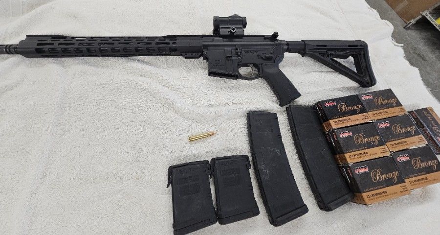 Palmetto State Armory AR15 Features Barrel: 18" 416R stainless steel barrel, chambered in .223 Wylde, with a 1:7 twist, and a rifle-length gas system. The barrel is finished with with a .750" diameter low-profile gas block, PSA 15" Lightweight M-Lok Free Float Rail and an A2 flash hider. Suparms adjustable gas block Sig Sauer red dot ROME078 scope Upper: Forged 7075-T6 A3 AR upper is hard coat anodized black for durability. Featuring M4 feedramp cuts, these upper upper receivers are made for us right here in the USA. Bolt Carrier Group: For AR15 and M16 rifles and carbines. Bolt is made of shot-peened, Mil-spec Carpenter 158® steel. Gas key is secured with grade 8 fasteners and staked. Includes Charging Handle. Lower Build Kit: PSA MOE EPT Lower Build Kit, Black Details Barrel Length: 18" Gas System: Rifle-Length Barrel Profile: A2 Barrel Steel: 416R Stainless Steel Barrel Finish: Stainless Muzzle Thread: 1/2-28 Chamber: .223 Wylde Twist Rate: 1:7 Diameter at Gas Block: .750 Gas Block Type: Suparms adjustable gas block Sig Sauer red dot ROME078 scope Muzzle Device: A2 Flash Hider Receiver Material: Forged 7075 T6 240- rounds 223 ammo 2 -10 round clips 2- 30 round clips