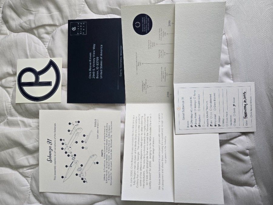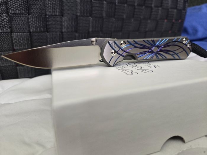 Brand new small sebenza with unique graphic. Specs: Drop point Cpm magnacut 63-64 rc Polished blade finish Right handed Polished titanium finish Silver hardware Overall Length: 6.98" (177.29mm) Closed Length: 3.98" (101.09mm) Blade Length: 2.99" (75.95mm) Blade Thickness: .120" (3.05mm) Never been used.