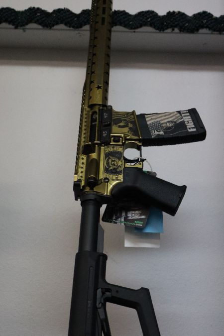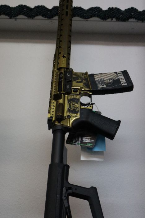 TRUMP GOLDEN ERA CUSTOM AR RIFLE BACK IN STOCK, 223/5.56, 16" CHROME MOLY BARREL, 15" MLOK HANDGUARD, "MAKE AMERICA GREAT AGAIN" "TAKE AMERICA BACK" 45/47, FIGHT FIGHT FIGHT, GOLD FINISH, COMES WITH CARRY CASE, 3 BOXES OF AMMUNITION AND 2 -30 ROUND MAGAZINES. $1499. PONDEROSA SPORTS, 6854 HIGHWAY 55, HORSESHOE BEND, IDAHO 83629. 208-793-3121. OPEN 10-6 DAILY. CLOSED ON TUESDAY. LAYAWAY AVAILABLE. SOLD ALL THE ORIGINAL BATCH OUT AND JUST GOT 2 MORE IN.