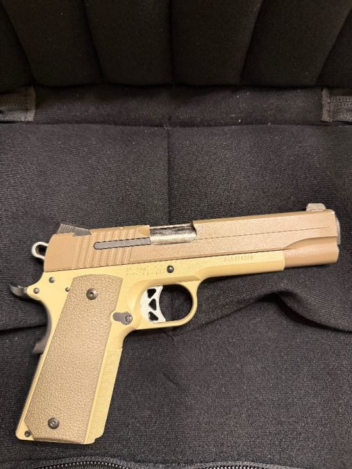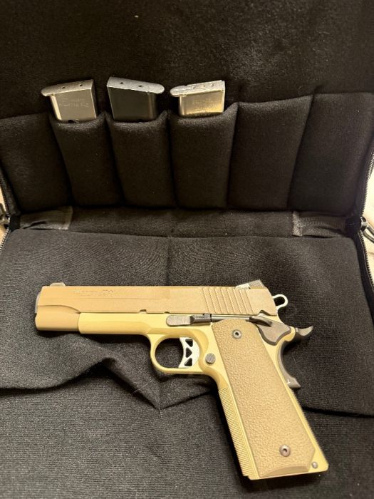 Sig sauer 1911 dessert .45 it’s super clean factory night sights shoots like a dream. Zero issues has 3 mags an owb holster and extras would possibly trade for Glock 45 9mm or other glock 9mm or pcc. Asking 1k obo