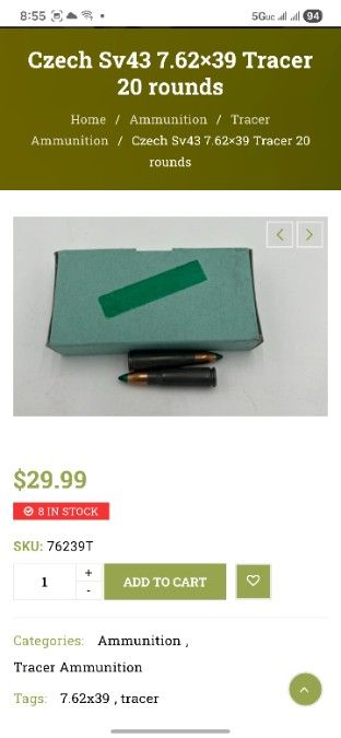 Czech SV43 7.62x39 green tip (burns red) tracer ammo. 24 boxes, 20 per box. 70 rounds without a box. 550 rounds total. $75 for the 70 loose rounds $25 per box