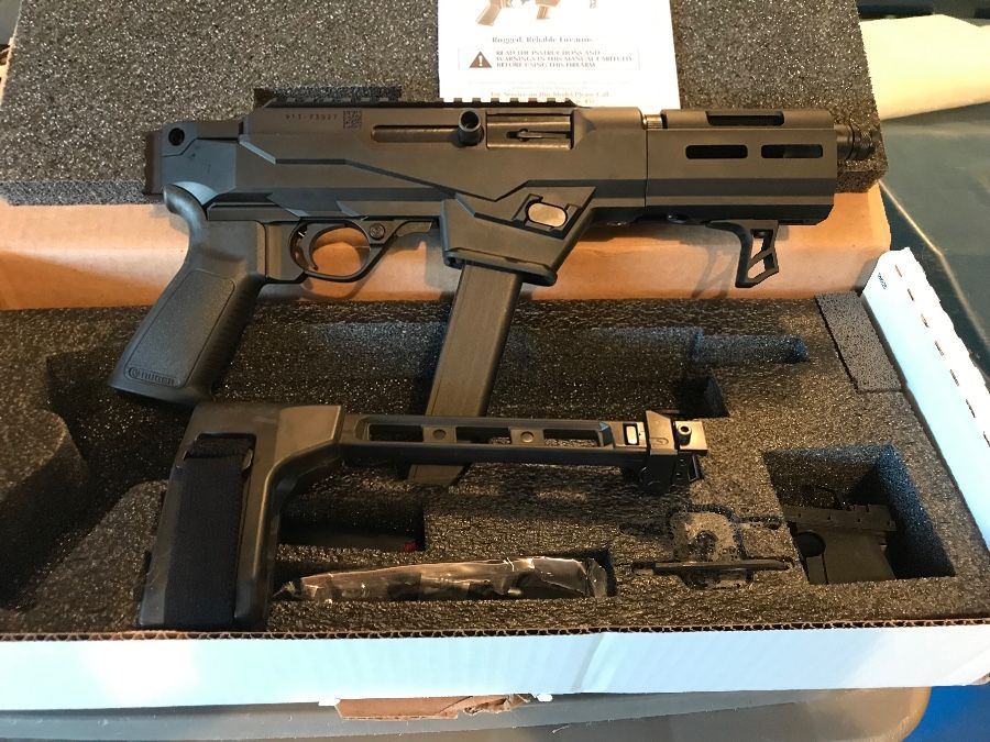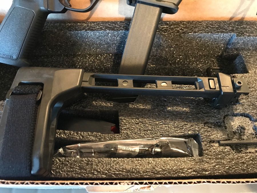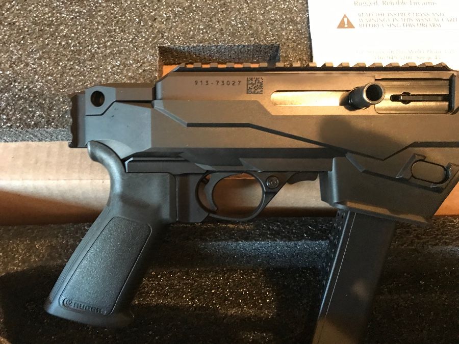 Ruger PC Charger6.5” Pistol. Chambered in 9mm. Accepts Glock Magazines. Comes With SB Tactical 1913 Folding Brace, Owner’s Manual, One 30-Round Magazine (Glock Style)and One 17-Round Magazine (Ruger Style). Never Fired. Cash Only, No Trades. In-Person Transaction.