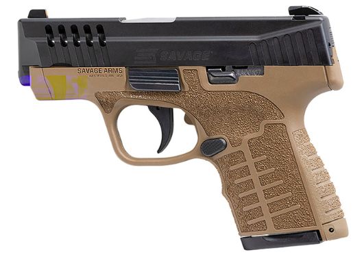 Savage Arms Stance 9mm Luger 2 Mags, 10+1 & 7+1, 3.2" Barrel, Flat Dark Earth w/Black Polymer Frame, Serrated/Ported Black Nitride Slide, Interchangeable Backstrap, Night Sights, No Manual Safety, Hard Case.