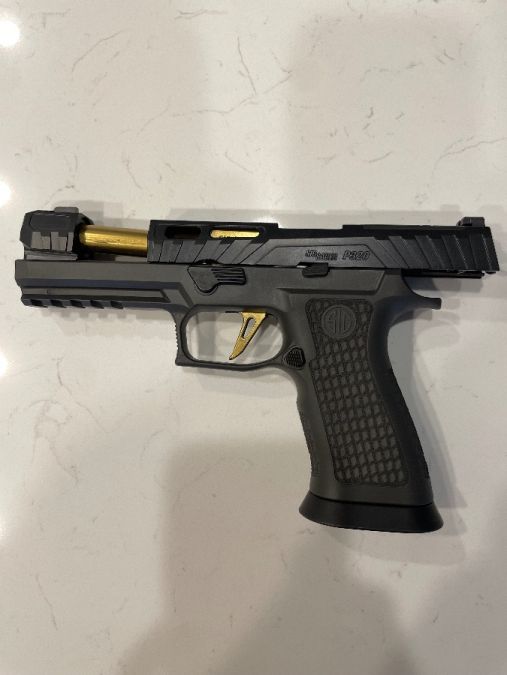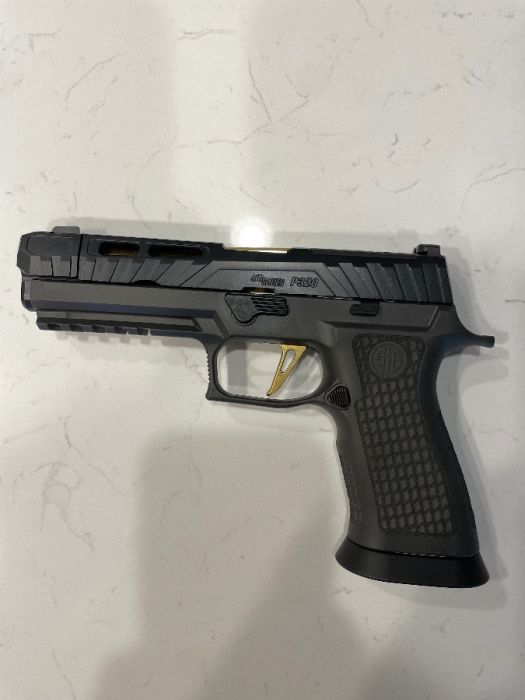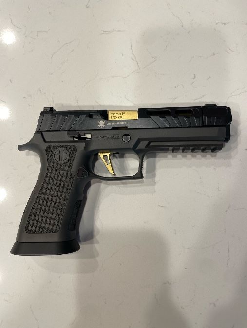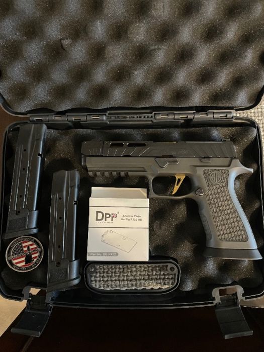 The one you’ve been waiting for! Located in Middleton, Sig P320 Spectre Comp 9mm, beautiful gun with maybe only a couple hundred rounds thru it. Cannot find anymore-comes with challenge coin, box, and two 21 round mags and DPP titanium optics plate ($40 value). Must see to appreciate. Retails is $1400. Thank you! The SIG SAUER® P320® Spectre Comp Semi-Auto Pistol with X-Ray3 Night Sights is a feature-rich, performance-enhanced pistol from SIG's Custom Works shop. SIG gives you a laser-stippled, TXG-tungsten-infused grip module and a custom slide with angled cocking serrations and lightening cuts. The slide is optics ready and comes equipped with XRAY3 day/night sights and a threaded barrel with a single-port compensator attached, greatly reducing recoil with higher-grain bullet weights. 2 taper screws allow you to simply remove and install the comp. The comp also houses the front sight, keeping it from reciprocating with the slide. The full-length frame pairs up nicely while matching the length of the comped slide setup. Optics ready Threaded barrel Compensator with front sight Aggressive serrations and lightening-cut slide Laser engraved stippling XRAY3 sights