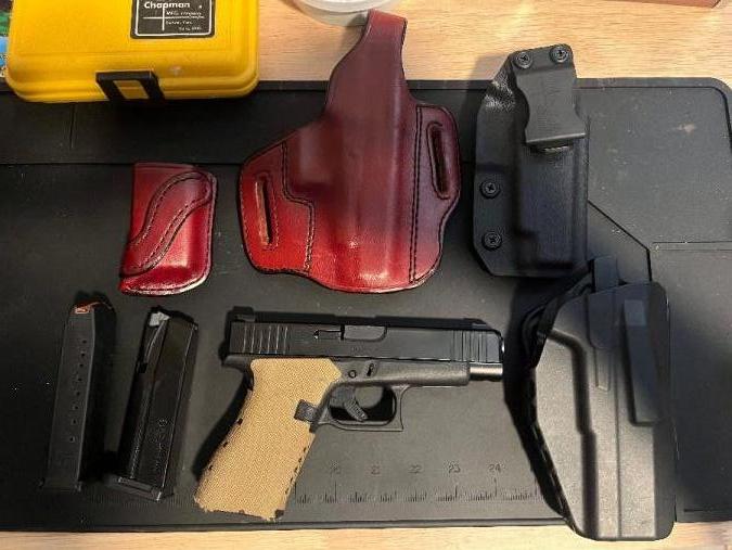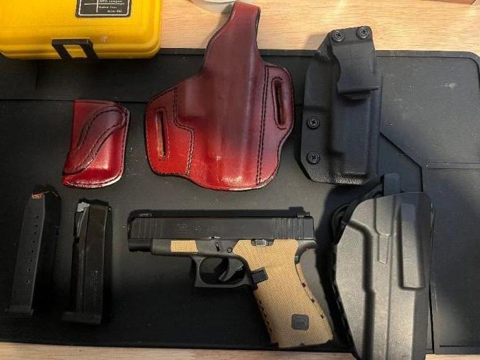 Glock 48 with accessories. One 10 round Glock mag, one 15 round Shield Arms mag, Safariland ALS holster, Don Hume leather holster with matching mag pouch, and kydex IWB holster. Aftermarket front tritium sight, serrated black rear. Combat textiles grip tape. Has about 150 rounds through it. No light rail. No MOS. Lowering the price to $400 for all.