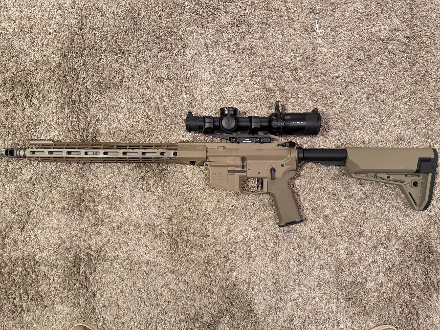 For sale is an Aero precision M4E1 AR15 chambered in .223 Wylde. Parts are as follows: Magpul buttock and grip Aero M4E1 upper/lower Aero atlas s-one hand guard 15” Superlative arms adjustable gas block Ballistic advantage Hanson barrel Epsilon VG6 muzzle brake Aero enhanced buffer tube/spring/buffer Blackout defense single stage drop in trigger 3lb Nickel boron coated BCG-can’t remember the make but it was roughly $200 Aero upper/lower parts kit Aero breach ambi charging handle. Vortex Strike Eagle 1-8x24 FFP LPVO This gun has maybe 10 rounds through it. Built it for the wife and it just sits in my closet so it’s going bye bye. $2000 or best offer. Again this is a BRAND NEW ar15