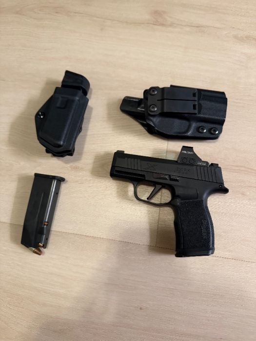 Sig P365x with Holosun HS507k red dot. Includes 2 spare mags (3 mags total, 2x12 rounds and 1x17 rounds), kydex mag carrier, and kydex holster. ***CWL required for peace of mind***